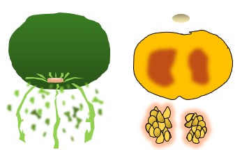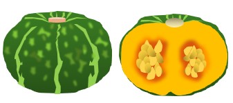 | かぼちゃ♪ 「冬至かぼちゃに年取らせるな」 名前に「ん」がつくものを食べさせる「運盛り」という習慣がある。 特に「ん」が2つ付くものは「冬至の七種」(ななくさ)と呼ばれる。 なんきん、にんじん、れんこん、ぎんなん、きんかん、かんてん、うんどん(うどん)のこと。 |